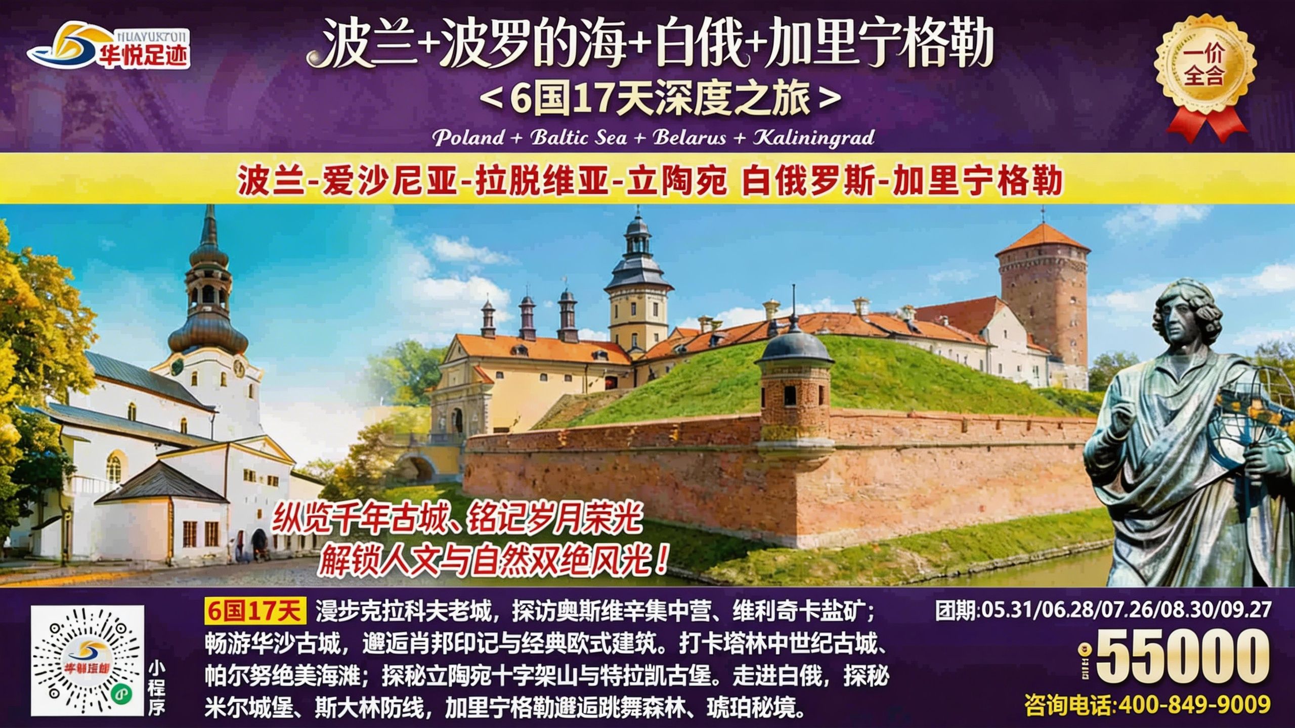 当经典西欧游已成常态,华悦足迹为你解锁欧洲小众深度新玩法——波兰、爱沙尼亚、拉脱维亚、立陶宛、白俄罗斯、加里宁格勒6国连游,17天沉浸式探寻中欧与波罗的海的独特魅力。这趟欧洲旅游团的匠心之作,串联起世界文化遗产、中世纪古城、自然奇观与人文秘境,深耕波罗的海旅游项目精髓,带你走出打卡式旅行,真正触摸欧洲大陆的多元底蕴。