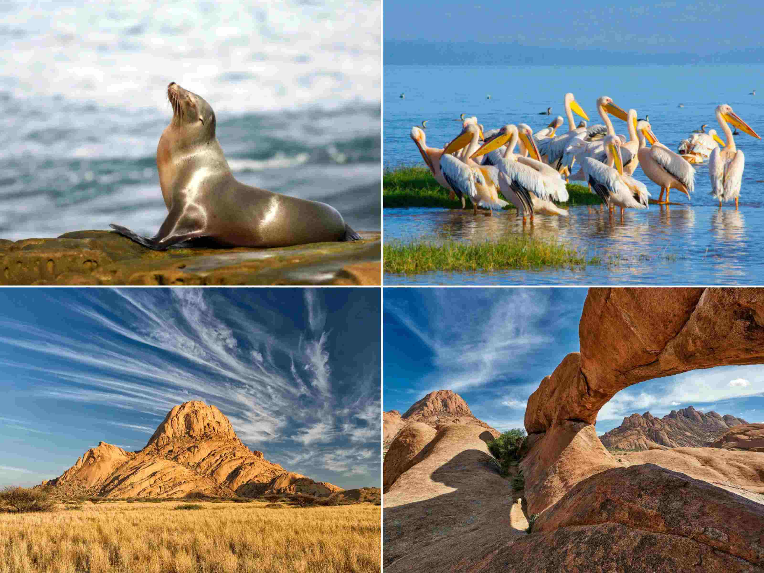 鲸湾港,滨海与沙漠的完美碰撞,乘坐豪华游艇出海,与海豹、鹈鹕、海鸥近距离互动,喂食海洋精灵,运气好还能邂逅海豚跟着游艇跳跃,感受海洋的灵动与浪漫;斯皮兹考普山作为纳米比亚国山,孤立于荒野之中,山体造型独特,周边留存着土著生活遗迹,徒步其间,尽览荒野之美。