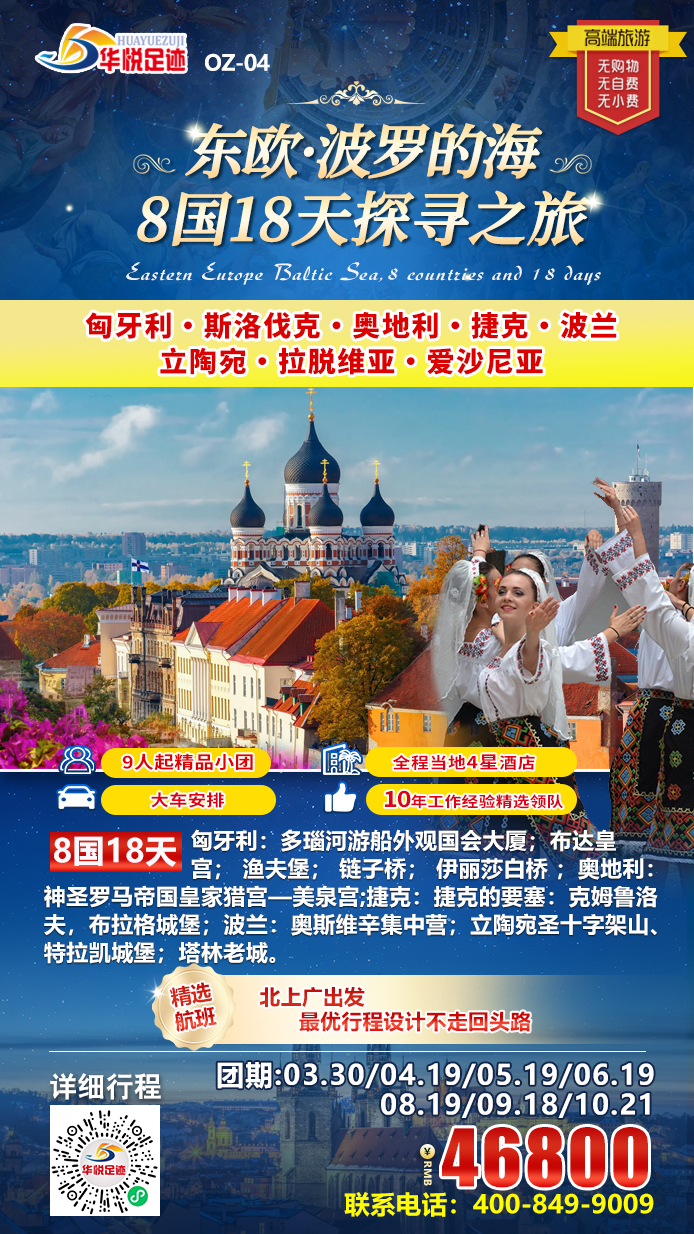 跟随华悦足迹,从波罗的海的白夜风情到中欧的艺术盛宴,从中世纪的历史回响到当下的烟火日常,八国风光,一步一景,一景一情。我们以初心赴旅程,让每一位旅人都能专注于风景本身,在漫步中感受历史的厚重,在沉浸中邂逅人文的美好,让东欧与波罗的海八国风情,成为镌刻在时光里的难忘回忆,让世界的风景,都留下华悦与你的共同足迹。