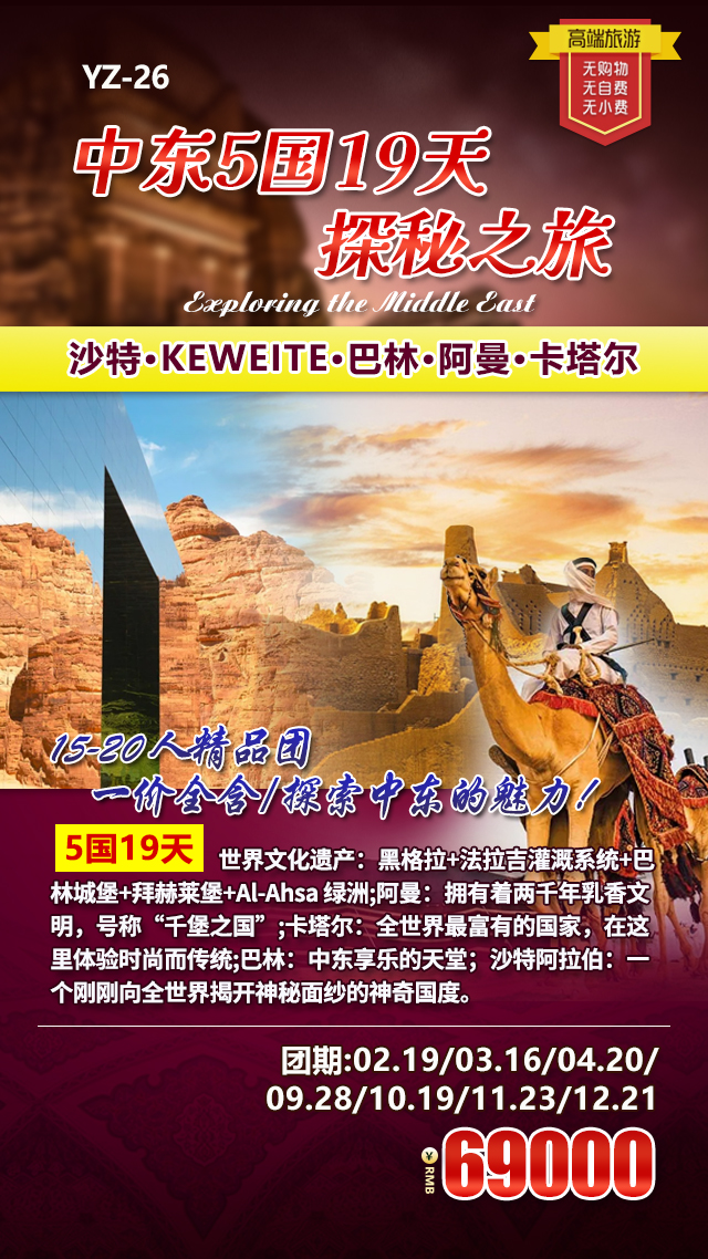 跟随华悦足迹,踏足阿拉伯半岛的广袤土地,沙特阿拉伯、科威特、巴林、阿曼、卡塔尔五国依次铺展画卷,既有千年文明的沉淀,也有现代奢华的绽放,沙漠的苍茫与海滨的澄澈交织,每一步都藏着不期而遇的惊喜,每一处都镌刻着独属于中东的浪漫与厚重,全程沉浸式感受五国迥异又相融的异域魅力。
