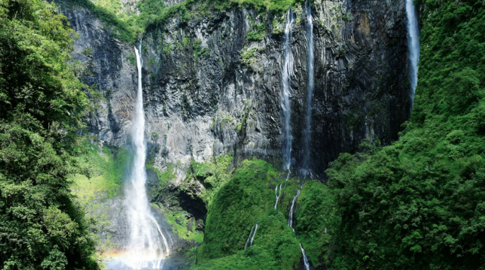 萨拉齐冰斗:留尼旺代表性冰斗,由火山喷发陷没形成,火山灰堆积肥沃,植被繁茂、水源充足,标志性的新娘头纱瀑布轻盈柔美,徒步其间宛如闯入世外桃源,是非洲旅游最佳路线中的原生态亮点。