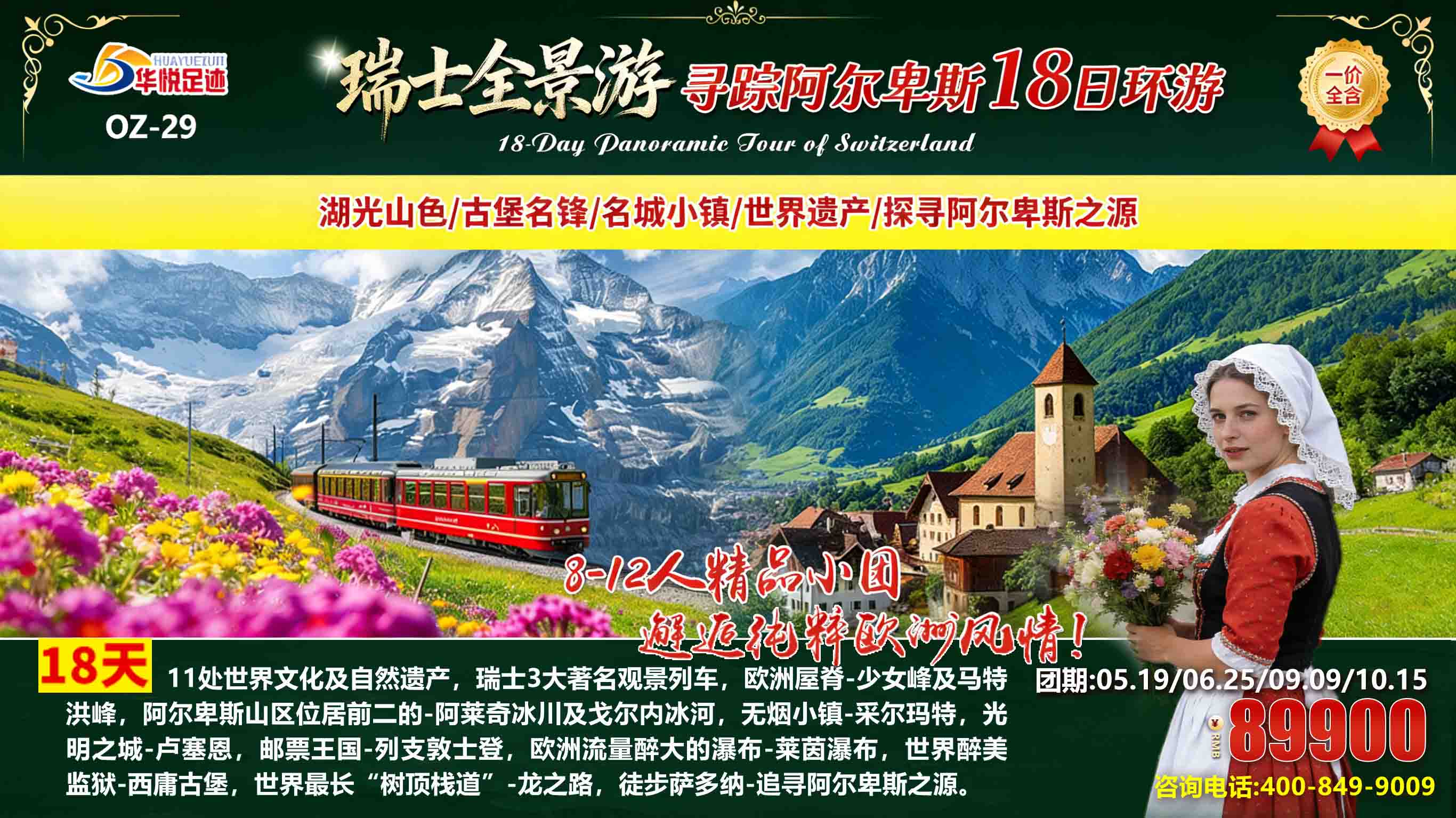 谁不想奔赴一场阿尔卑斯的浪漫之约?这份超实用瑞士旅游攻略,带你解锁欧洲仙境的全部美好!华悦足迹专属打造瑞士全景游·寻踪阿尔卑斯18日环游,串联瑞士核心美景与小众秘境,不用费心做瑞士旅游攻略,跟着我们,沉浸式感受瑞士的雪山、冰川、湖泊与小镇,每一处都藏着让人沦陷的惊喜。