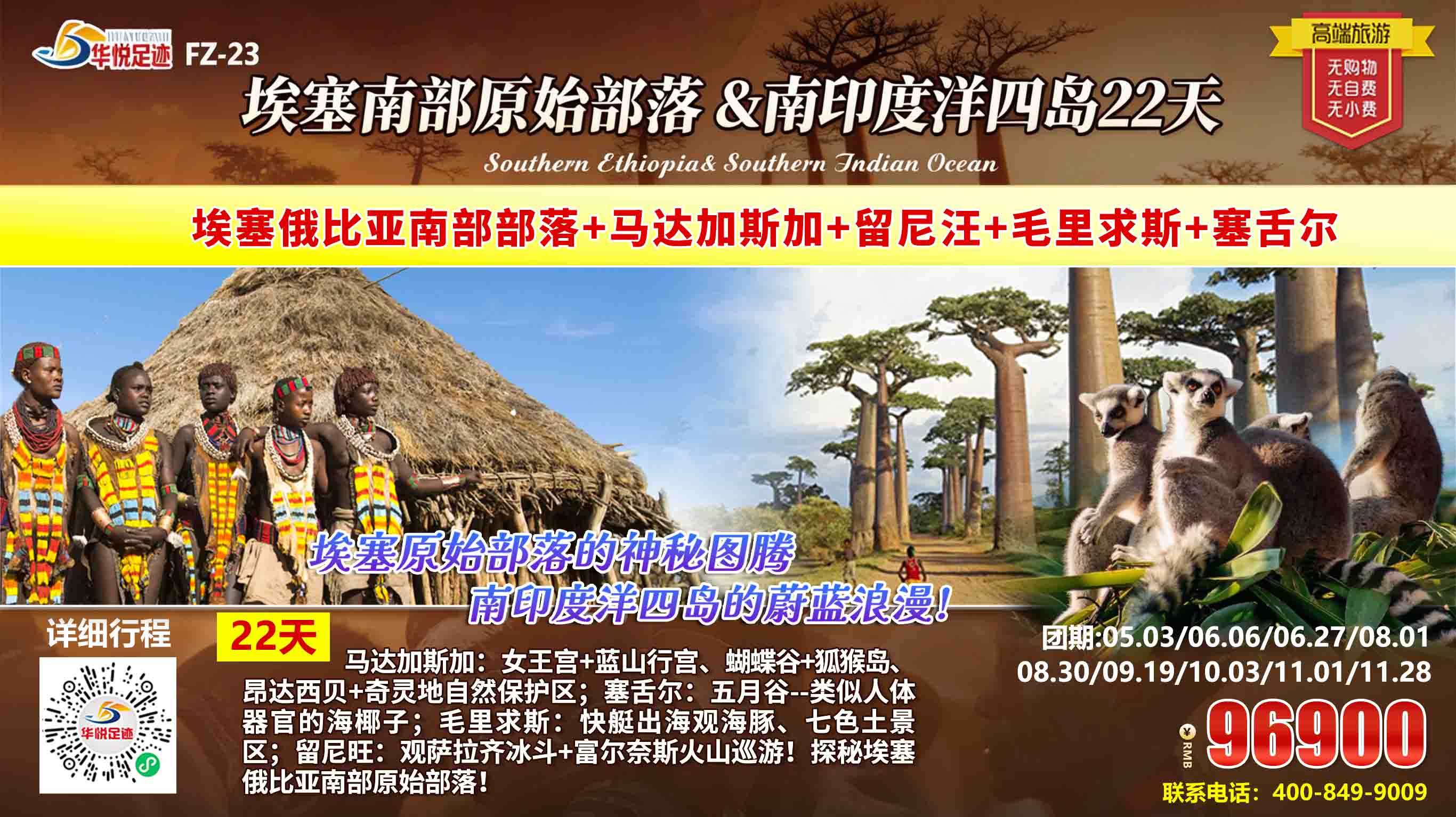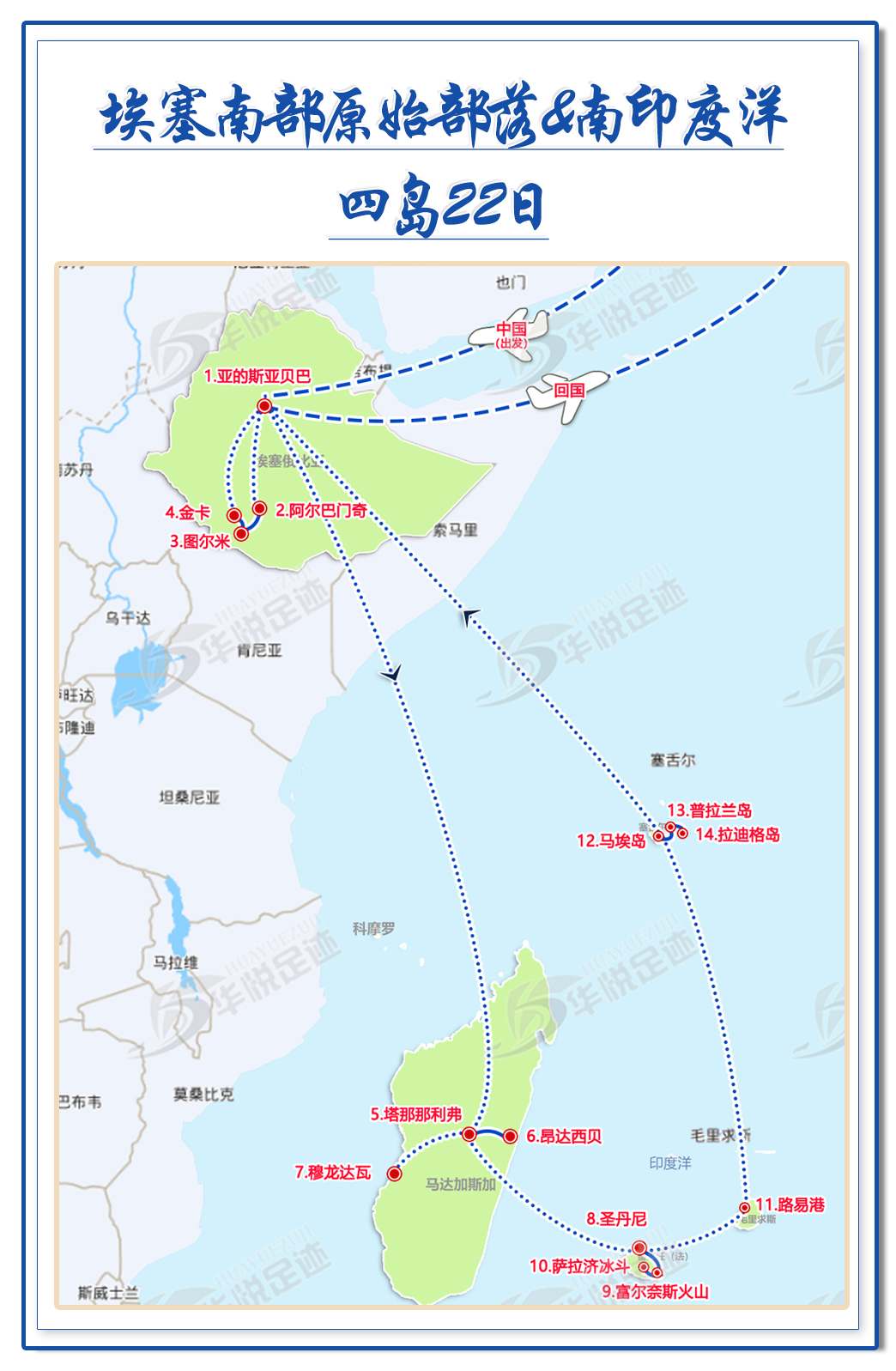 华悦足迹埃塞南部原始部落&南印度洋四岛22天深度游,以非洲旅游最佳路线为核心,串联非洲旅游必去的国家与南印度洋绝美海岛,解锁数十处震撼的非洲旅游景点与海洋秘境,从埃塞部落人文、马达加斯加动植物奇观,到留尼汪火山冰斗、毛里求斯与塞舌尔滨海风光,旅程处处是惊喜,风景皆值得珍藏。