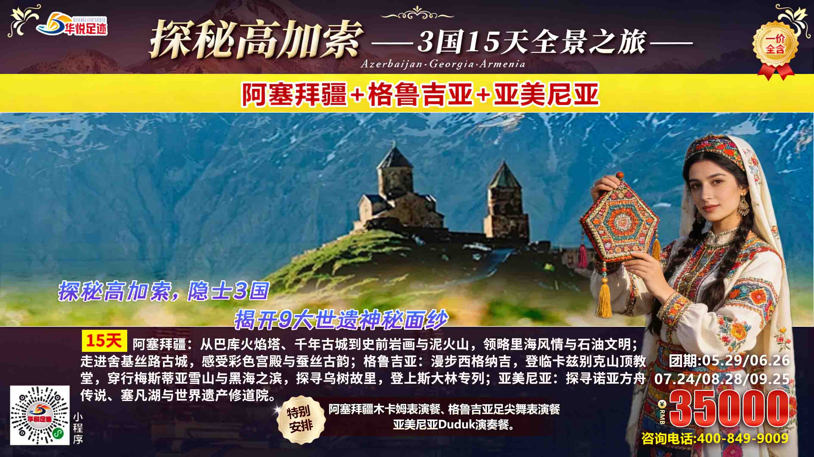 15天,3国,9大世界遗产,无数自然与人文惊喜!华悦足迹高加索3国15天深度游欧洲旅游团,带你逃离人潮,解锁欧亚交界的小众秘境。在高加索旅游最好的季节,跟着我们走进阿塞拜疆、格鲁吉亚、亚美尼亚,触摸千年文明,邂逅山海盛景,感受歌舞美食的浪漫,留存一段独一无二的欧洲旅行记忆!不用再纠结高加索旅游攻略,华悦足迹已为你规划好一切,快来赴这场世遗与山海的约会吧!