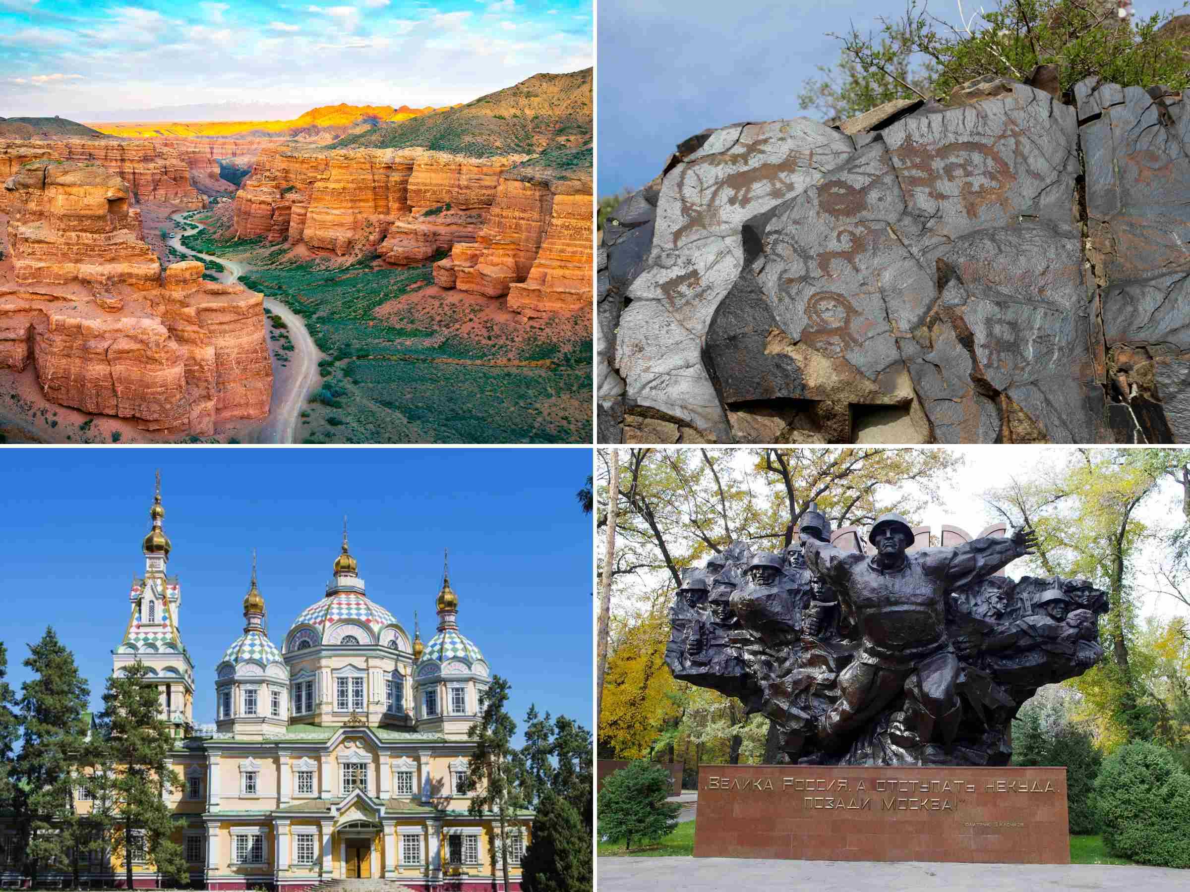 在哈萨克斯坦,你将穿行恰伦大峡谷—— 亿万年风雨侵蚀而成的红色峡谷,层峦叠嶂、怪石嶙峋,地貌壮阔震撼,堪比美国科罗拉多大峡谷,行走其间,能真切感受到自然的鬼斧神工与人类的渺小。泰姆格里考古景观岩刻是世界文化遗产,5000 余幅古老岩画跨越三千年,记录着游牧民族的狩猎、祭祀、星辰与生活,是一部刻在山石上的 “草原史书”。阿拉木图的升天大教堂以纯木建造、不用一钉,潘菲洛夫公园、国家乐器博物馆、绿市场,则藏着这座城市的温柔与烟火。