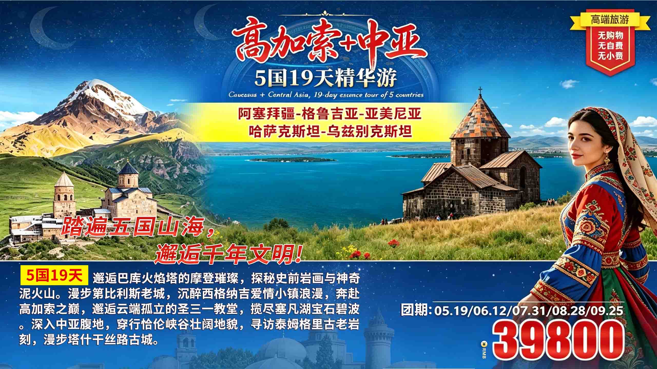 在亚欧大陆的交界地带,藏着一片少有人踏足的秘境 ——高加索与中亚。这里是诸神的后花园,是丝路的十字路口,是火焰与雪山共生、信仰与传奇交织的土地。华悦足迹匠心打造高加索深度+中亚5国19天顶级亚洲旅游团,一次走遍阿塞拜疆、格鲁吉亚、亚美尼亚、哈萨克斯坦、乌兹别克斯坦,把高加索旅游攻略里所有封神场景、世界遗产、雪山圣湖、丝路古城与非遗艺术一网打尽。不用熬夜做攻略、不用反复折腾签证交通、不用妥协住宿与体验,全程以舒适节奏、深度视角、沉浸式体验,带你读懂高加索的苍茫神圣与中亚的辽阔厚重,完成一场真正意义上 “一生一次” 的文明穿越之旅。