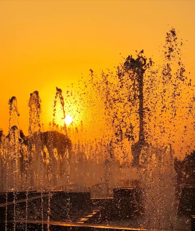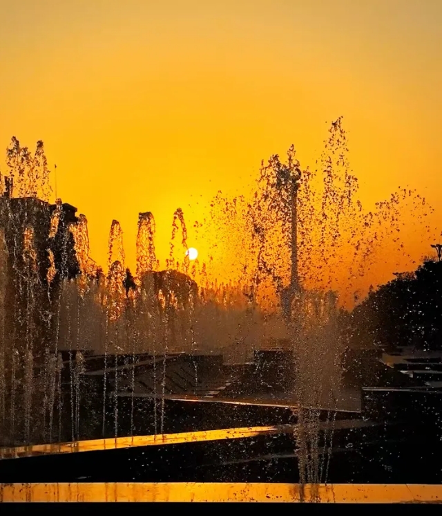 由于导游在博物馆讲解过于兴奋,多讲了一个小时,因此,当我来到索莫尼广场,太阳正在落下,夕阳照在喷泉和索莫尼纪念碑时,泉水和地面变得金黄,纪念碑闪着金光,这一刻美极了,惊呆了我,从未见过这么漂亮光影的城市建筑。