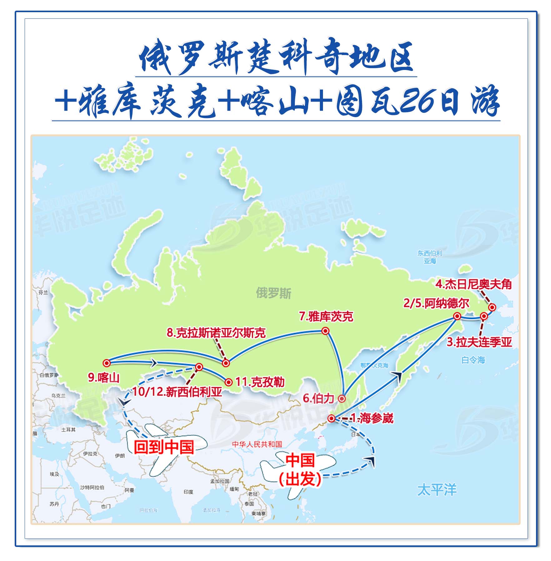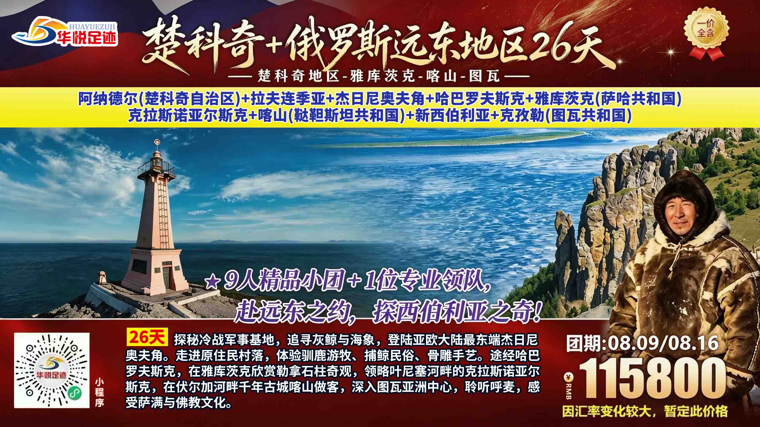 当北极的风掠过亚欧大陆最东端的海岸,当万年冻土封存着史前巨兽的传奇,当伏尔加河的波光映照着千年古城,当萨满鼓声与佛教梵音在亚洲中心回响 —— 华悦足迹旅游团以极致匠心,打造俄罗斯楚科奇+雅库茨克+喀山+图瓦26日全域深度之旅。这不仅是一场旅行,更是一次跨越纬度、穿越时空、深入荒野与文明内核的极致远征。作为专业俄罗斯旅游团、高品质亚洲旅游团,我们深耕俄罗斯旅游攻略精髓,拒绝走马观花,拒绝大众化路线,只为带你抵达常人难以企及的秘境,看见世间罕见的风光,读懂这片辽阔大地的灵魂与传奇。