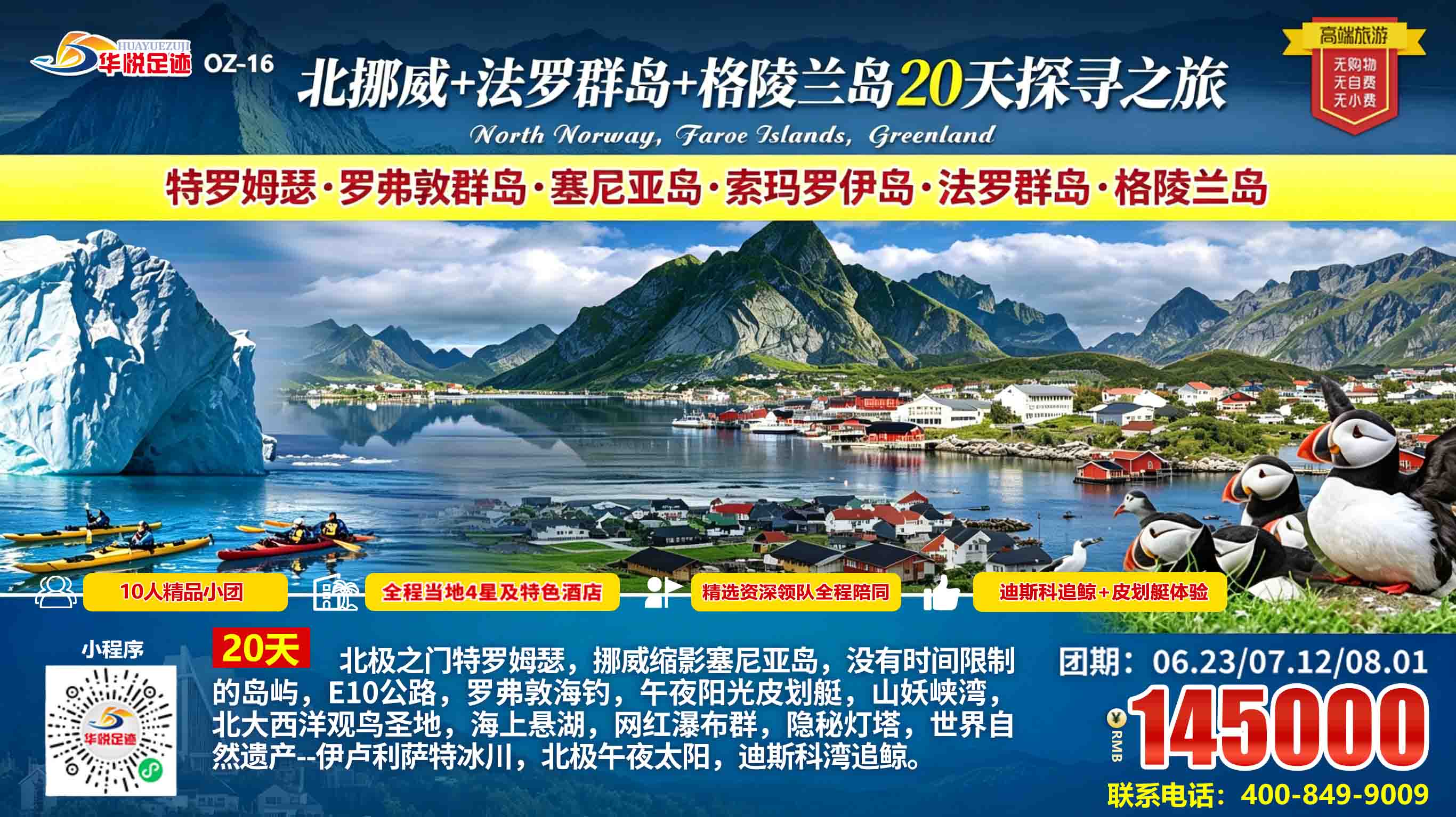 华悦足迹匠心打造北挪威+法罗群岛+格陵兰岛20天极致探寻之旅,作为深耕极地线路的高端欧洲旅游团,我们以专业法罗群岛旅游攻略为路线蓝本,深度解锁格陵兰岛旅游景点核心精华,串联北极峡湾、童话渔村、海上悬湖、千年冰川、彩色小镇与因纽特人文,全程舒适住宿、专业领队护航、一价全含无忧、纯玩深度体验,带你远离人潮,直抵地球最震撼的极地秘境,完成一场终身难忘的世界尽头远征。