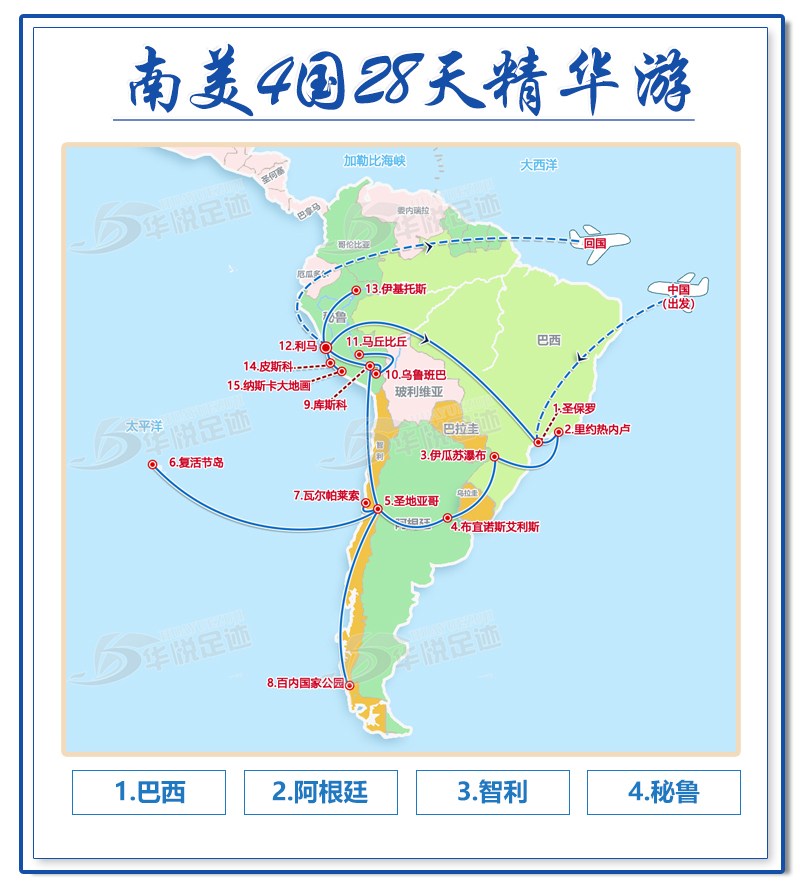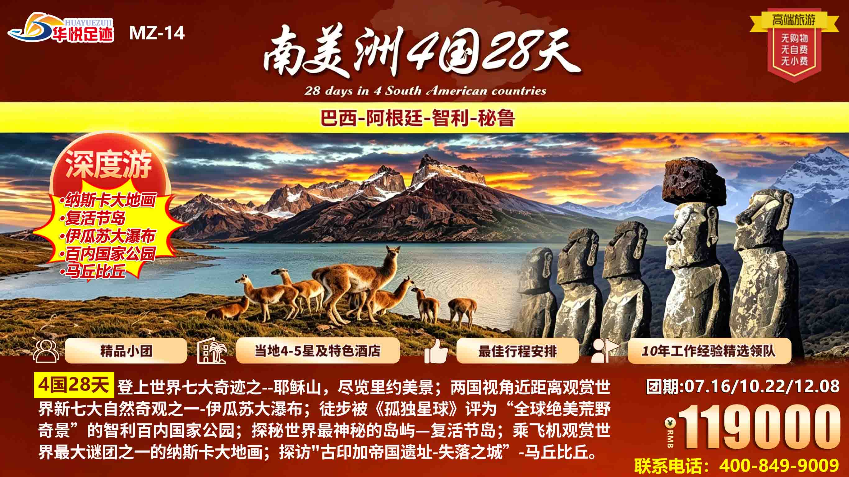 华悦足迹深耕高端出境旅游多年,专为旅行爱好者打造这场南美4国28天深度环游,以高端配置与专业服务,让你安心畅享荒野与文明的盛宴: