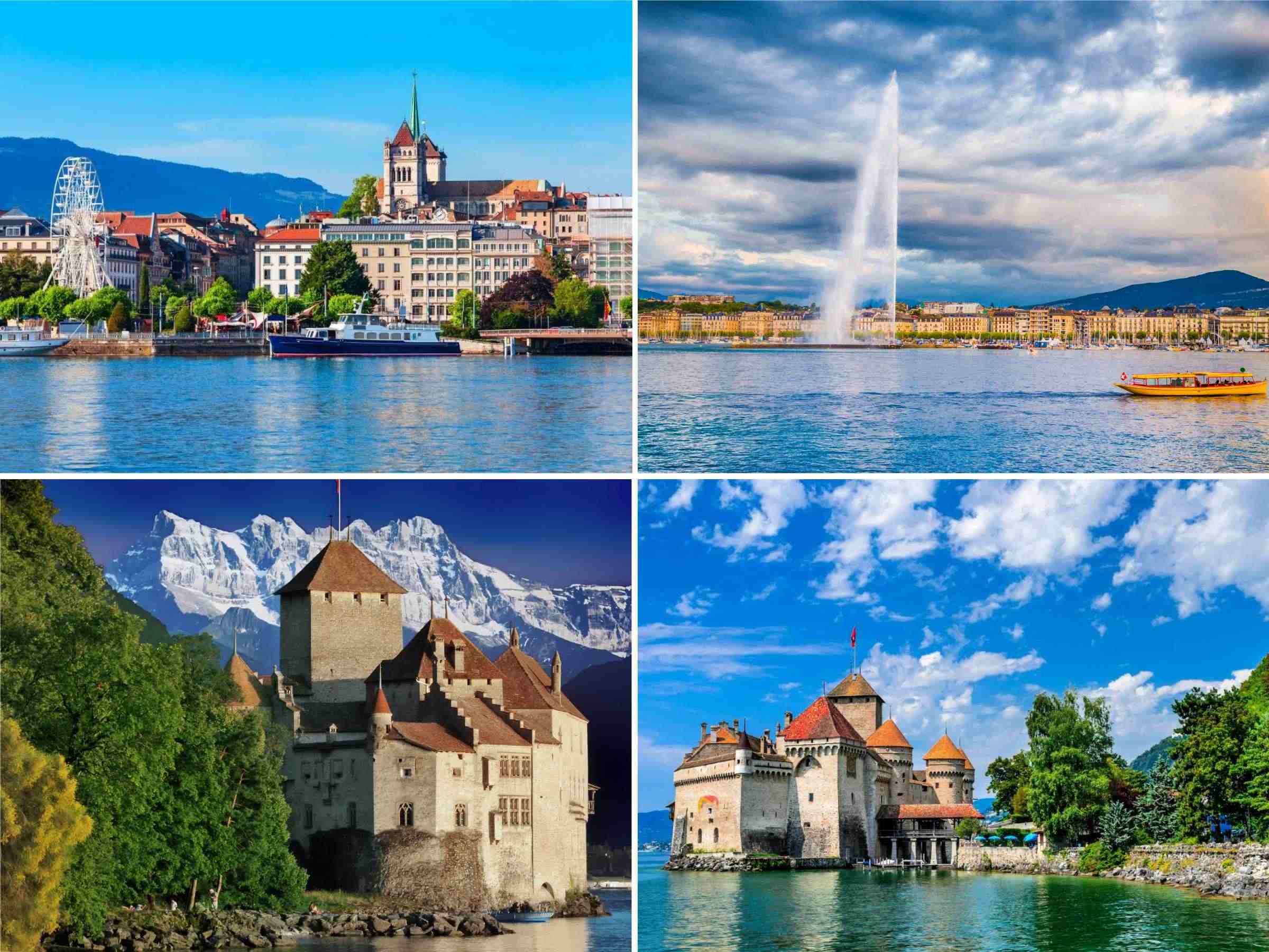 日内瓦,坐拥日内瓦湖,大喷泉气势磅礴,水柱冲天,震撼人心;大花钟用鲜花计时,创意十足。蒙特勒,依偎日内瓦湖畔,西庸城堡漂浮水面,古老石堡、湖水、雪山相映成画,是瑞士最古老、最著名、最上镜的童话城堡,《贝多芬》《拜伦》《雨果》等文学艺术大师为之赞颂。