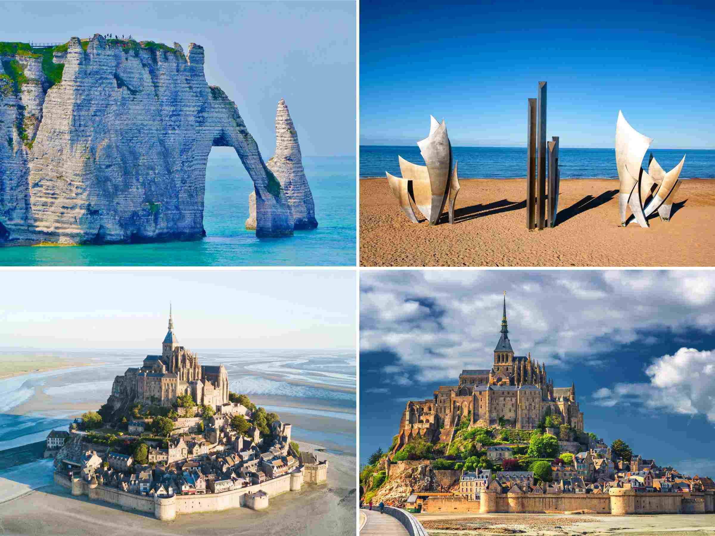 诺曼底海岸,象鼻岩矗立海中,悬崖壮阔,海浪清新,莫泊桑、莫奈、福楼拜等文学艺术大师为之沉醉;奥马哈海滩、黄金海滩,纪念诺曼底登陆,致敬和平;圣米歇尔山,法国最具神话色彩的世界文化遗产,一座矗立在潮汐孤岛之上的中世纪神迹,涨潮时岛屿与大陆隔绝,宛如漂浮在海上的仙山;退潮时沙滩裸露,可近距离感受孤岛的神秘。山顶的中世纪修道院高耸云端,建筑工艺精湛、气势庄严,从 1017 年奠基到 1080 年落成,耗时六十余载,是宗教与建筑艺术的巅峰之作。日出日落时分,光影变幻、云雾缭绕,修道院在霞光中宛如天国之城,是欧洲最震撼的宗教与自然双重奇观。