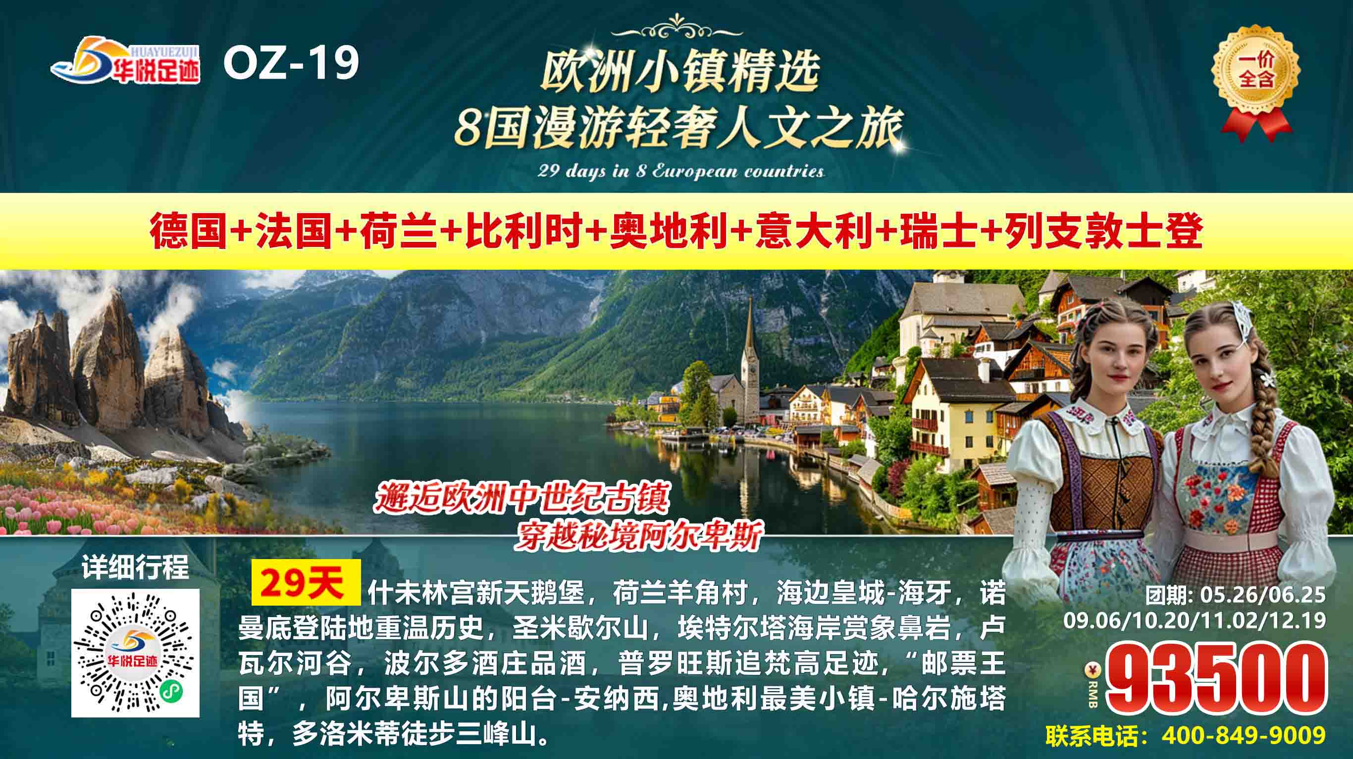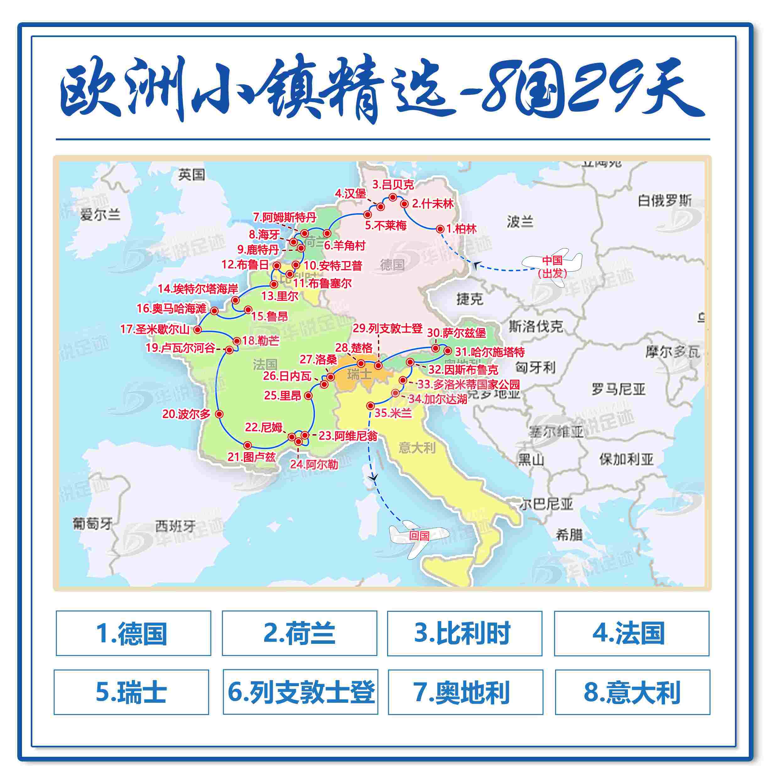 华悦足迹打造德国、法国、荷兰、比利时、奥地利、意大利、瑞士、列支敦士登8国29天全景深度漫游。这不是一次普通的走马观花旅行,而是一场穿越时光、拥抱自然、感受文明、治愈心灵的生命修行。全程遵循最地道、最深度、最舒适的旅行理念,全覆盖欧洲顶级地标、世界文化遗产、秘境小镇、自然奇观、葡萄酒乡、童话古堡、雪山湖泊、运河水乡,拒绝走马观花、拒绝强制购物、拒绝套路行程,用29天从容时光,带你真正读懂欧洲、感受欧洲、爱上欧洲。