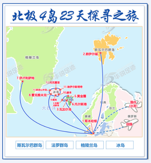 华悦足迹北极旅游团重磅推出「斯瓦尔巴群岛+格陵兰岛+法罗群岛+冰岛」23天深度环线,一次走遍世界最北端的人类居住区、全世界最美群岛、世界第一大岛屿,更完整解锁冰岛环湖全景盛宴。作为专业高端北极旅游团,我们带你穿越冰与火的史诗,沉浸式感受北极的野性、纯净与壮阔,每一步都踩在世界尽头的浪漫里,每一眼都是终生难忘的风景。