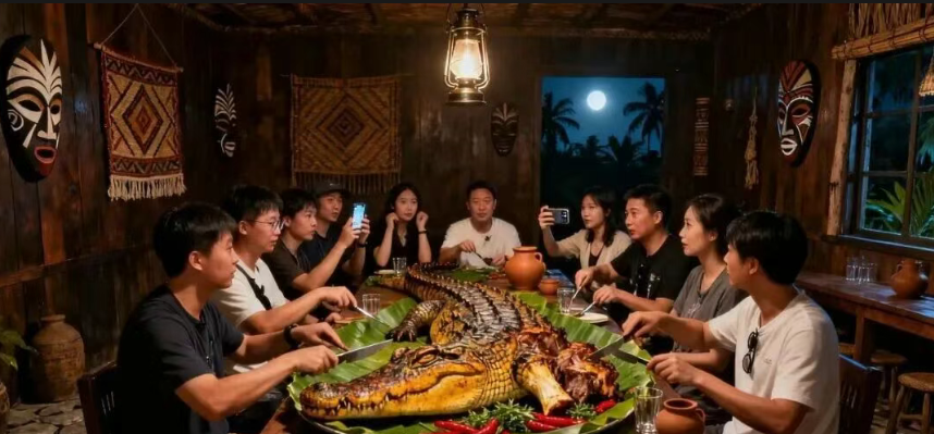 不一会儿,服务员端着一盘“特立独行”的鳄鱼肉上桌了。那卖相,怎么说呢,有点“狂野不羁”,跟我们平时吃的那些精致料理完全不是一个画风。鳄鱼肉表面泛着一层独特的油光,纹理清晰可见,仿佛在诉说着它曾经的“凶猛”。邓总满脸笑容,像个专业的美食解说员一样解释道:“这可是遵循加蓬传统工艺烹制的哦!”我们纷纷点头,心里却暗自嘀咕:“这传统手艺,还真是够‘地道’的!”我鼓起勇气,切下一小块鳄鱼肉送进嘴里。好家伙,这口感,就像味蕾在坐过山车,先是有点硬邦邦的,仿佛在跟我较劲,接着又带着一股说不出的“野性”味道,仿佛在跟我抗议:“嘿,我可不好惹!”不过,咱也不能怂啊,硬着头皮嚼了几下,还装作很享受的样子对同伴们竖起大拇指:“不错不错,有特色!”同伴们看着我那夸张的表情,都忍不住哈哈大笑起来。