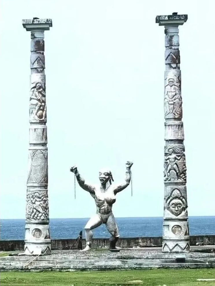 我怀着崇敬与好奇,来到了加蓬的海岸线。这里是一片与天际温柔相拥的蔚蓝海域,海浪轻轻拍打着沙滩,仿佛在诉说着古老的故事。而在这片海岸上,与加蓬总统府遥遥相对的,是一座庄严肃穆的黑奴解放纪念碑。当我走近这座纪念碑,心中涌起一股难以言喻的震撼。它由两根巍峨的石柱和一个雄伟的人形雕塑构成,宛如一位沉默而坚定的历史守护者。那两根石柱笔直地矗立着,像是历史的两根支柱,承载着无数被岁月掩埋的往事。