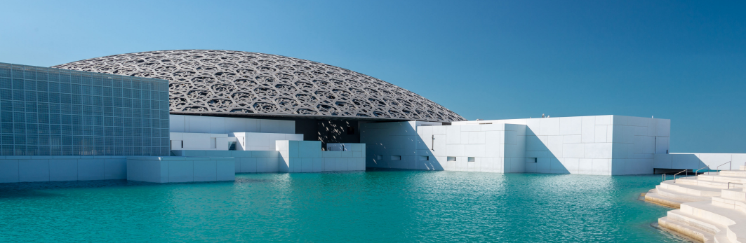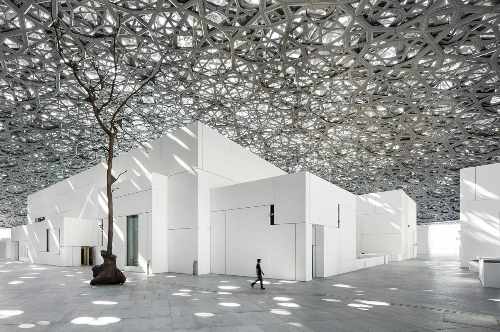 【卢浮宫阿布扎比分馆】坐落于萨迪亚特岛。由普利兹克奖得主让・努维尔设计,其银色穹顶洒下 “光雨”。馆内藏品超 600 件,跨越古今、融合多元文化 。