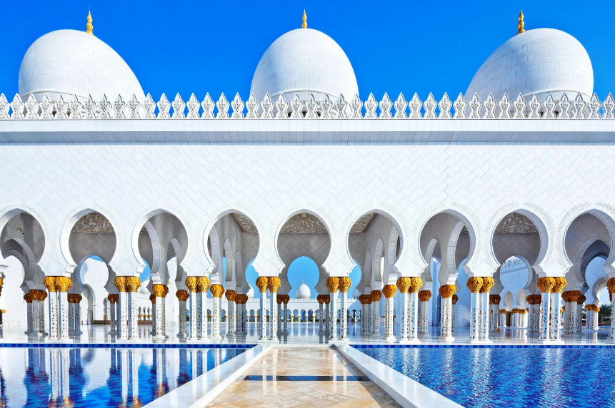 【谢赫扎耶德清真寺】世界第三大清真寺,历时 13 年耗资 55 亿美元建成。汉白玉筑就,黄金水晶点缀,有世界最大手工波斯地毯,美轮美奂,震撼心灵。