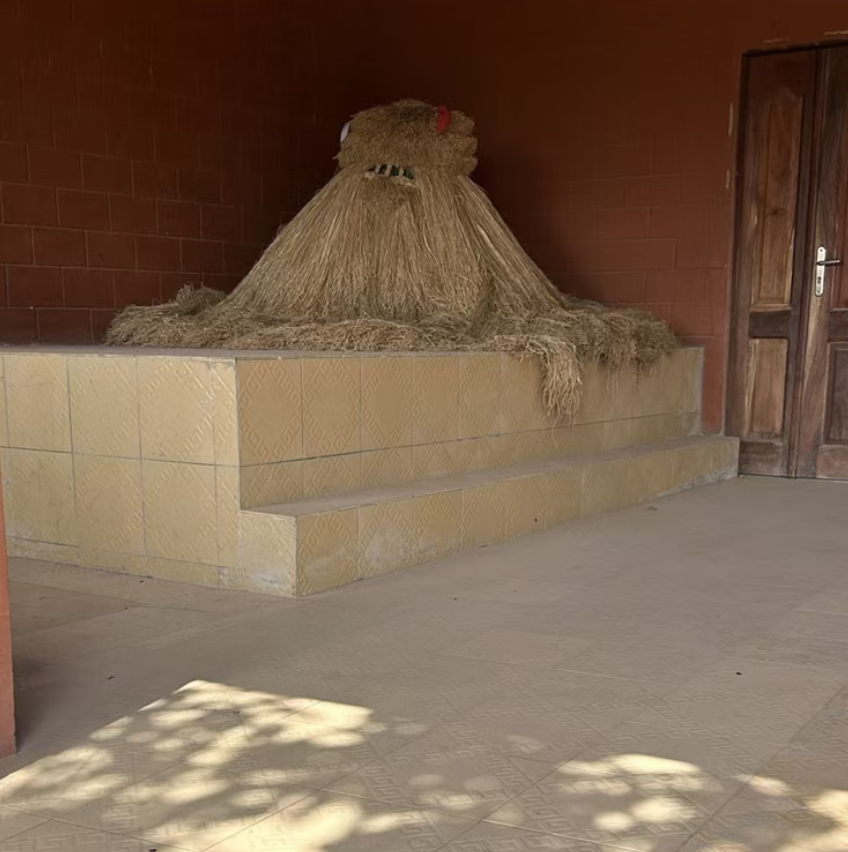 巫毒教祭祀小院就在大教堂窄巷对面,建筑墙面上有大型的鸟类浮雕,这种鸟类形象是伏都教中的神灵符号,代表着特定的神灵或力量。祭祀小院内有稻草堆砌的祭祀造型,地面还摆放着装有祭品的盘子和容器,这些都是伏都教祭祀活动的体现,用于向神灵供奉、祈求庇佑或达成某种仪式目的。