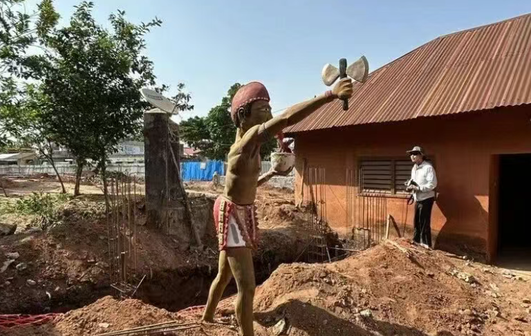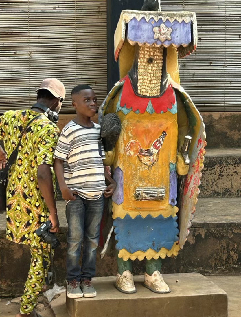 告别学生群体,我们沿着庭院的石板路走向王宫的广场区。刚踏入开阔的广场,一尊色彩斑斓的贝宁风格木雕彩绘雕像便攫住了所有人的目光。它立在广场中央,造型夸张却充满张力,朱红、明黄、靛蓝的颜料在阳光下格外鲜亮,仔细端详,雕像表面的公鸡图案昂首挺立,星形纹饰错落分布,每一处细节都透着西非传统艺术独有的奔放与灵动。