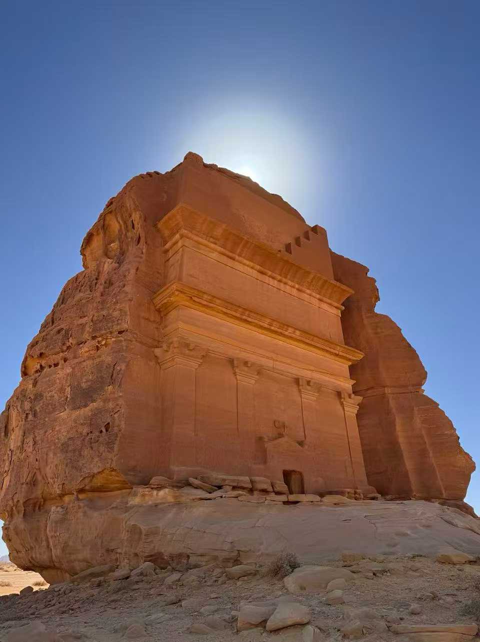 - 黑格拉(Hegra):沙特首个被列入联合国教科文组织世界遗产名录的考古遗址(2008 年入选),也是纳巴泰人除佩特拉(约旦)之外的另一座重要城市。这座古城始建于公元前 1 世纪,曾是丝绸之路沿线的重要贸易枢纽,如今保存着 100 多座完好的岩刻陵墓,这些陵墓依山而建,由红色砂岩雕琢而成,外形酷似外星基地的建筑,线条简洁流畅,上面雕刻着精美的图案与铭文,记录着纳巴泰人的宗教信仰、生活习俗与商业活动。黑格拉的陵墓分为不同的等级,大型陵墓可能属于国王或贵族,雕刻更加复杂,而小型陵墓则可能是普通民众的安息之地。其中最著名的是 “艾尔・法拉夫拉墓”(Al Farafra Tomb),墓门上方雕刻着鹰的图案,象征着权力与神圣。漫步在黑格拉的荒漠中,看着这些沉默的岩刻陵墓,仿佛能穿越到两千多年前,感受纳巴泰人的辉煌与神秘。