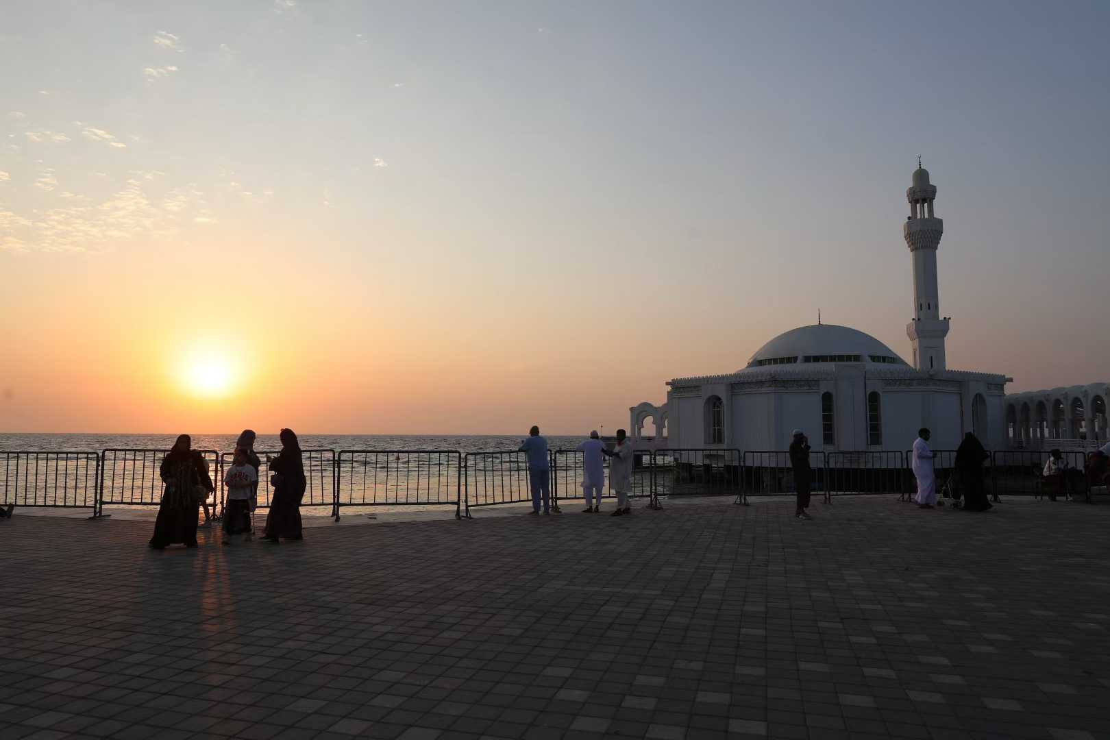 - 水上清真寺(Floating Mosque):吉达的标志性建筑,也是红海之滨最浪漫的景观之一。这座清真寺名为 “艾尔・拉赫曼清真寺”(Al-Rahman Mosque),因其建在红海沿岸的浅滩上,涨潮时仿佛漂浮在海面上而得名 “水上清真寺”。清真寺的主体建筑采用白色大理石建造,穹顶与尖塔洁白如玉,在阳光下熠熠生辉,与蔚蓝的红海、湛蓝的天空构成一幅绝美的画面。日落时分是观赏水上清真寺的最佳时间,当夕阳的余晖洒在清真寺的穹顶上,将其染成温暖的金色,海面上波光粼粼,清真寺的倒影与实景交相辉映,如诗如画,让人沉醉。清真寺内部装饰华丽,墙壁与天花板上雕刻着精美的伊斯兰图案,彩色玻璃窗户过滤出柔和的光线,营造出庄严而神圣的氛围。需要注意的是,进入清真寺需遵守宗教礼仪,女性需佩戴头巾,穿着长裤或长裙,男性需穿着长裤,脱鞋进入。