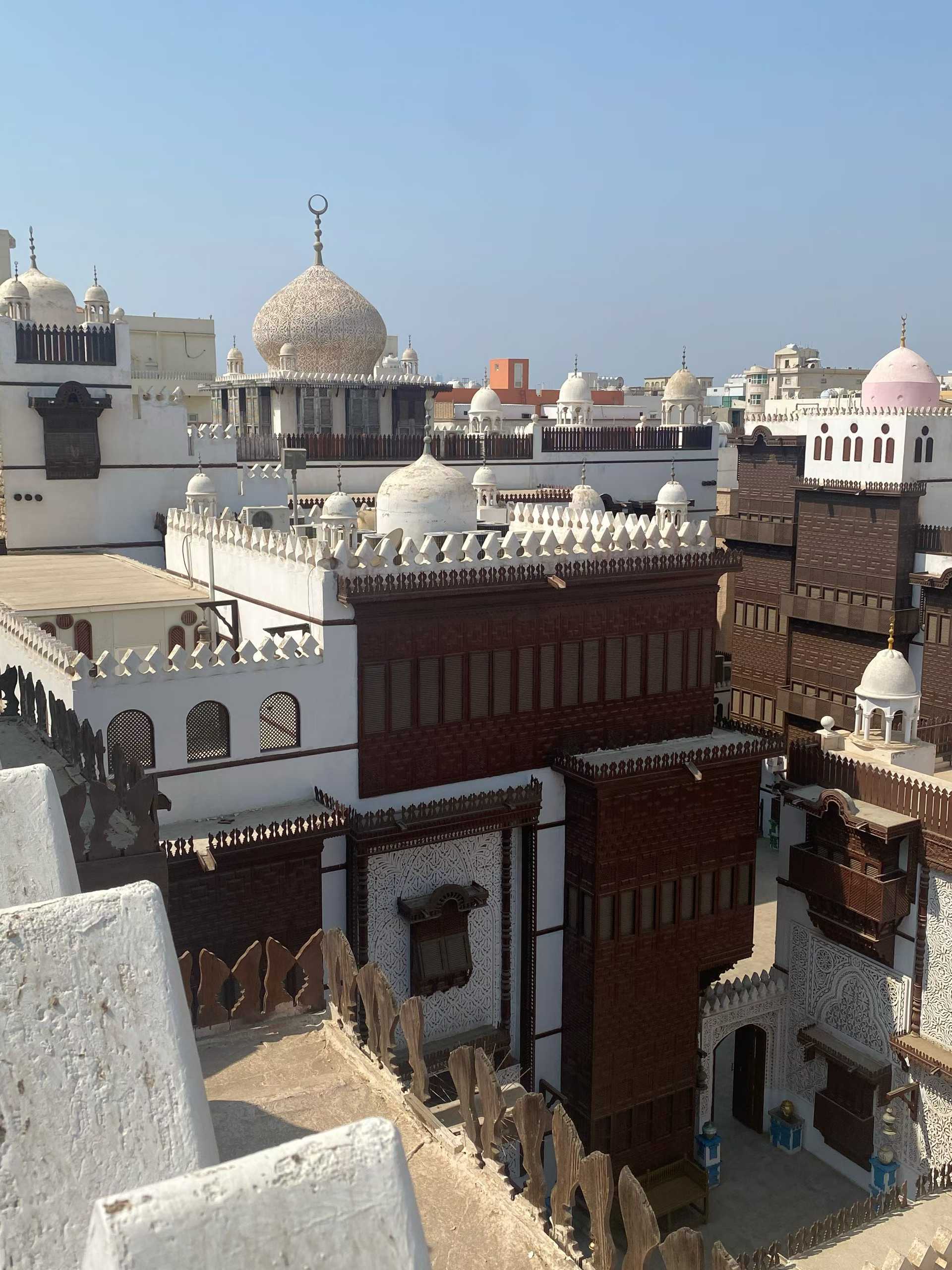 - 阿尔巴拉德老城(Al-Balad):吉达的历史核心,也是联合国教科文组织认证的世界遗产(2014 年入选)。这座老城始建于 7 世纪,曾是红海贸易的重要港口,也是伊斯兰教朝觐者前往麦加的必经之地,如今仍保存着完整的传统建筑群与街巷格局。阿尔巴拉德老城的建筑极具特色,多为三层或四层的楼房,采用珊瑚石与石灰石为主要材料,墙体厚实,窗户狭小,以抵御红海的潮湿与烈日的暴晒。屋顶上矗立着独特的 “风塔”(Wind Tower),这是阿拉伯传统建筑中的通风设施,通过风塔将冷空气引入室内,调节室内温度,是适应热带气候的智慧结晶。老城内的街巷狭窄曲折,如迷宫般纵横交错,两旁的建筑色彩鲜艳,门窗上装饰着精美的木雕与铁艺,充满了异域风情。在这里,你可以看到民间乐队敲着达夫鼓(Daf)演奏传统音乐,听到商贩们用阿拉伯语吆喝着售卖香料、珠宝与手工艺品,感受到浓厚的市井气息。老城内还有不少历史遗迹,如始建于 16 世纪的艾尔・马利基耶清真寺(Al-Malikiya Mosque)、保存完好的古代商栈、传统的阿拉伯庭院住宅等,每一处都诉说着吉达的千年历史。