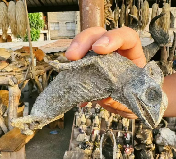 夕阳西下,市场开始进行清场工作,此时野生动物保护官员的巡查引发了一阵小小的骚动。某位摊主慌忙遮盖穿山甲鳞片,这一幕并非是巫毒教信仰本身存在问题——事实上,多哥传统巫毒教始终强调“敬畏自然灵”,明确禁止过度猎杀野生动物。非法野生动物贸易现象的出现,是资本介入后对传统信仰的一种扭曲。团里大妈们的拍照行为,看似是在进行“正义举报”,实际上却混淆了“传统信仰”与“非法贸易”之间的明确边界:巫毒教所使用的灵性媒介,本应来源于自然死亡的动物,而非通过非法猎杀获取。