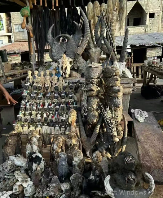 支付 10 美元的“仪式入场费”后,我们踏入了这个被外界解读为“巫术迷宫”的特殊空间。数百张木桌在烈日的炙烤下有序铺展,实际上,这些木桌的摆放遵循着巫毒教“天地人”的宇宙观布局。东侧摆放着水生动物的骨骼,这些骨骼象征着水神 Mami Wata;西侧则陈列着陆生兽类的遗骸,代表着地灵 Sakpata;而中央区域摆放的则是祖先灵媒介,像鳄鱼头骨、猩猩手掌、土狼头等,这些物品皆是经过巫医进行“启灵仪式”后,被赋予了神圣意义的器物。