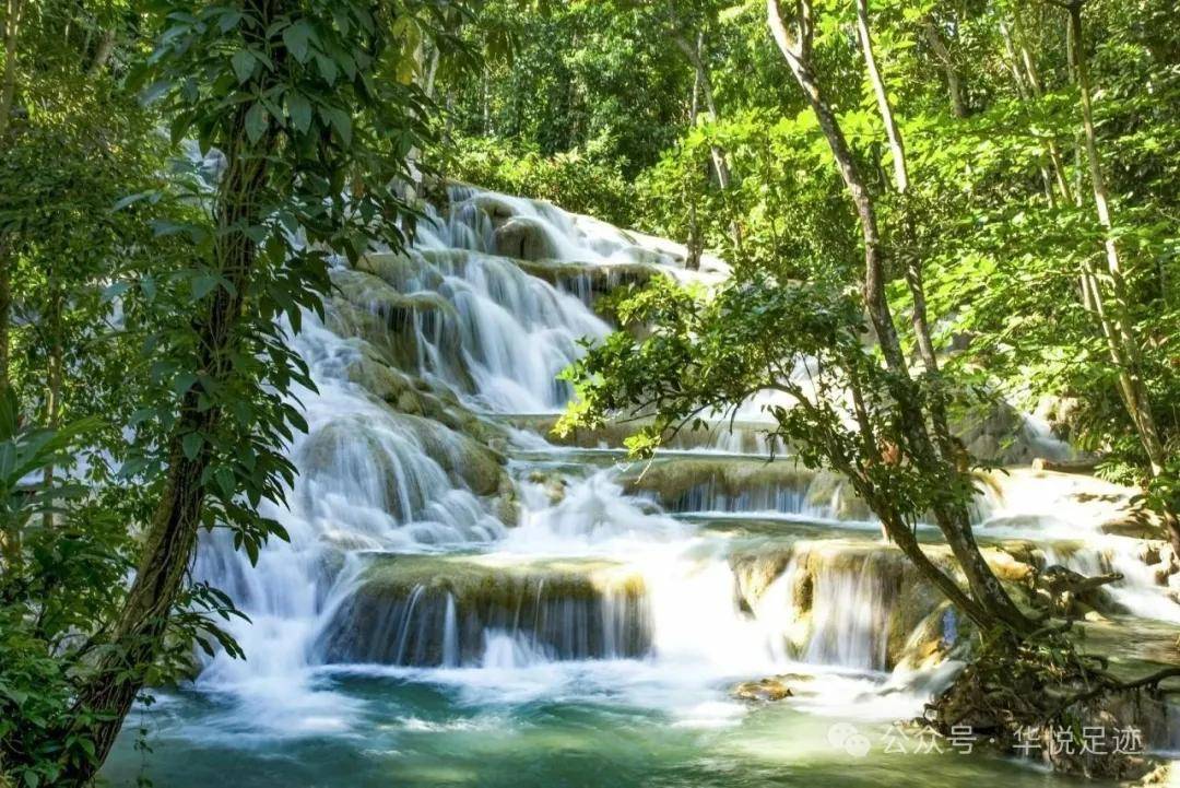 高约 55 米长 180 米,呈阶梯状直泻加勒比海。瀑布石床光滑,游客可攀爬,周边植被环绕,是加勒比海不容错过的美景。
