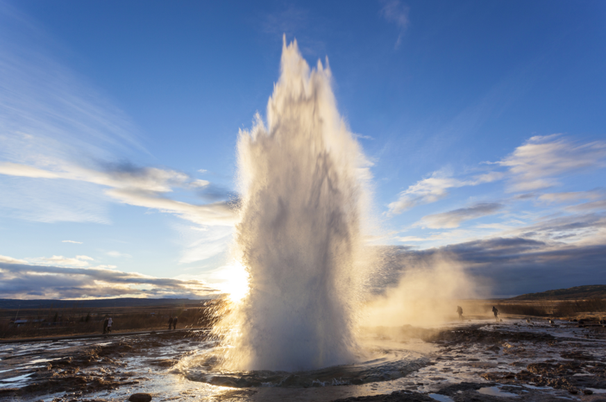 【间歇喷泉】位于冰岛,是世界著名间歇泉。圆池直径 20米,泉眼水温超百度,喷发时水柱高达 20 米,场面壮观,令人称奇。
