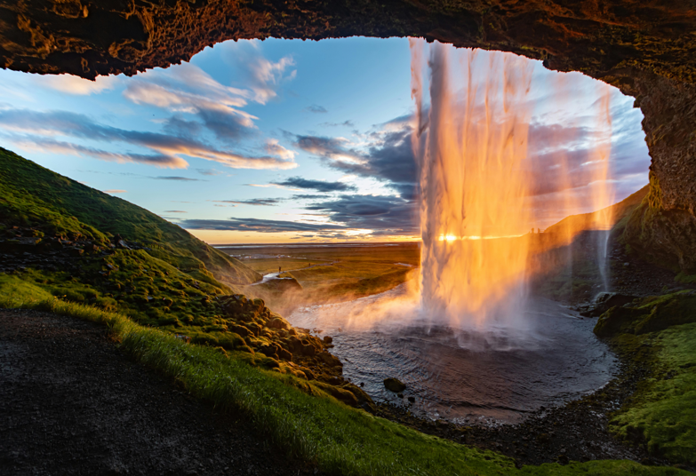 【塞里雅兰瀑布】位于冰岛南部,高 60 米,水源来自冰川融水。可绕至瀑布后观赏,黄昏或极光下美如仙境,是冰岛必打卡的绝美自然景观。