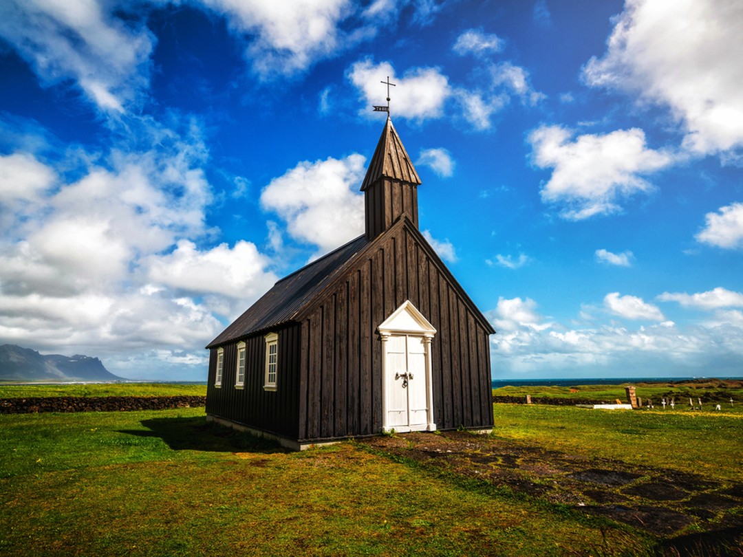 【布迪尔黑教堂】坐落于冰岛斯奈山半岛,建于 1703 年,以黑色木墙搭配白色门窗的独特外观闻名。背靠火山岩,面朝大西洋,与荒野、海浪共筑冷峻又神秘的地标景致。