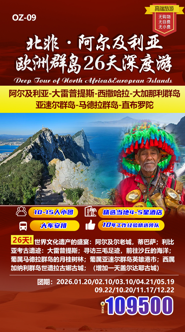 北京华悦国际旅游有限公司精心策划了一场为期 26 天的非凡旅程,带您跨越北非与欧洲,深入探索阿尔及利亚、利比亚、西撒哈拉、加纳利群岛、马德拉群岛、亚速尔群岛以及直布罗陀的独特魅力。
