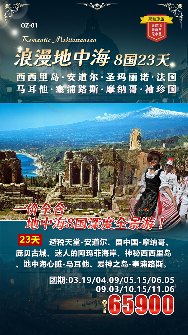 告别碎片化旅行,用一次旅程读懂地中海的多元文明。华悦足迹·地中海8国23天之旅,邀你邂逅西西里的热烈、袖珍国的精致、法兰西的浪漫,在千年古迹与蔚蓝海岸间,收藏属于你的欧洲记忆。即刻启程,让地中海的微风,吹醒心中的旅行梦想。
