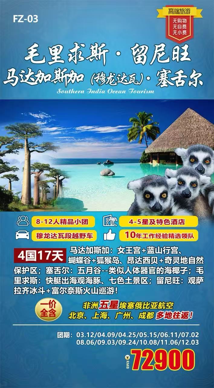 从毛里求斯的浪漫风情到留尼旺的冒险激情,从马达加斯加的野趣生灵到塞舌尔的奢华静谧,华悦足迹印度洋4岛17天之旅,不止是一次旅行,更是一场跨越自然与人文的深度对话。告别千篇一律的海岛游,让我们一同扬帆印度洋,在香草飘香的海风中,收藏此生难忘的秘境记忆。即刻启程,与华悦足迹共赴这场山海之约。
