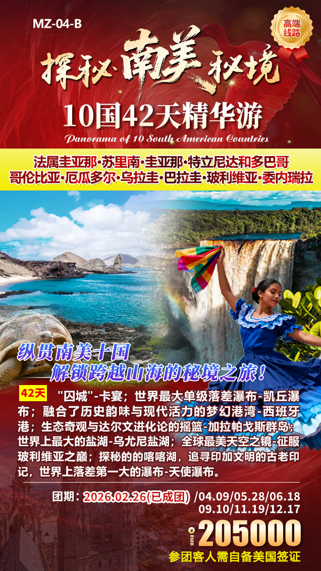 当世界的大多数角落沦为寻常风景,南美洲依然保留着地球最本真的悸动——这里有安第斯山脉的巍峨脊梁,有亚马逊雨林的神秘回响,有殖民古城的彩色风情,更有10个国度串联起的多元文明密码。华悦足迹重磅推出南美洲10国42天全景探秘之旅,跨越哥伦比亚、委内瑞拉、苏里南、圭亚那、法属圭亚那、特立尼达和多巴哥、厄瓜多尔、玻利维亚、巴拉圭、乌拉圭,以深度沉浸式行程,带您解锁这片大陆的所有惊艳与传奇。