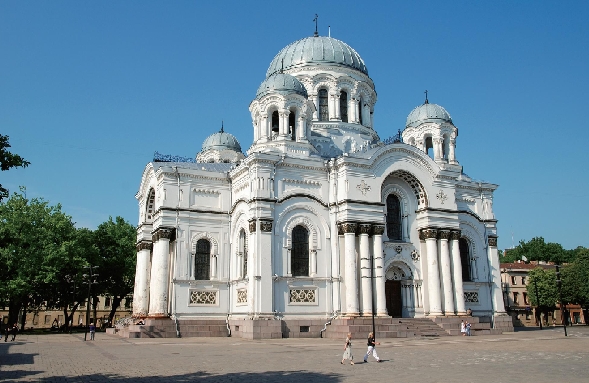 之后,前往参观俗称“白天鹅”的考纳斯城,中古世纪时期古城亦曾在第二次世界大战期间当了20年立陶宛的首都,参观考纳斯市市政厅广场,考纳斯大教堂。蓝色的新拜占庭式圣米迦勒大天使教堂建于1893年,占据了自由大道的东端。以及巴洛克式建筑的教堂、画廊、博物馆。