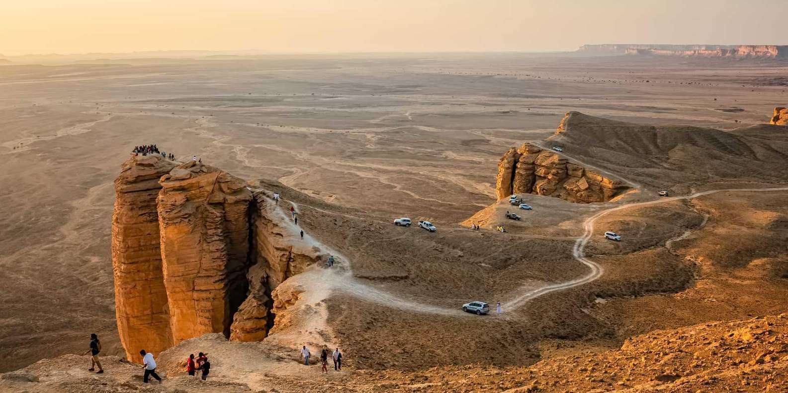 酒店早餐后开车前往沙特王发迹之地—德拉伊亚(AD DIR'IYAH)参观【哈尼法干涸河床上的远古遗迹】,为参观后乘车前往【世界的尽头】游览,此景点离利雅得市内约 80 公里左右,车辆全程在戈壁滩上行驶,路途较颠簸