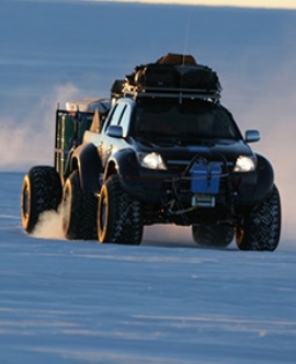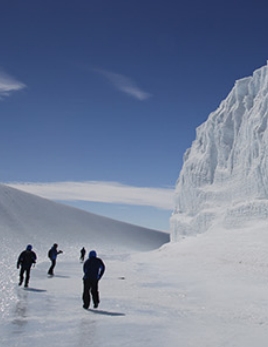搭乘超酷的丰⽥雪地改装车,前往南极⼤陆边缘的冰架巡游,进⾏体验式冰川徒步和冰墙攀爬。 在冰上活动中,请全体队员注意听从探险向导关于冰⽖使⽤的讲解,务必服从探险向导的指令,切勿单独⾏动或做出危险动作。请时刻注意脚下冰⾯情况和可能出现的阵风。