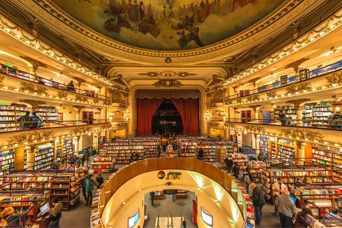 上午参观由百年剧场改建的世界至美书店之一——雅典人(El Ateneo)。该建筑始建于1919年,当时是Teatro Grand Splendid大剧院,天顶画、华丽的雕刻和奢华的红色大幕布,El Ateneo依然保留着当初的雄伟壮观 (参观时间约1小时)。
