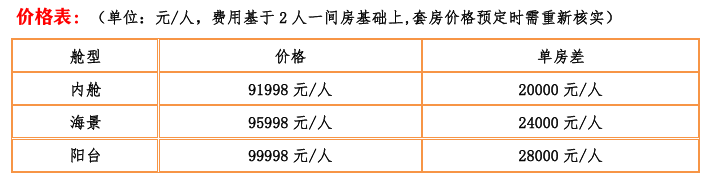 4、邮轮及酒店单房差:单男或单女在无法拼房入住的情况下,需另补房差;