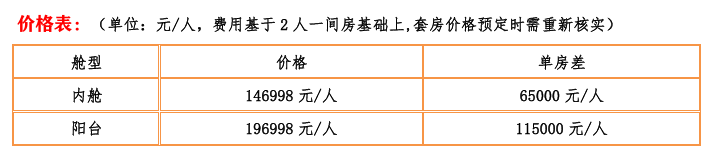 1. 邮轮船票及港务税费(船票包含:2人一间邮轮房费、早午晚餐、24小时茶和咖啡自助式供应及船上提供的免费酒水、政府税、码头税、娱乐服务、船上免费设施设备使用);