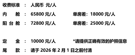 4、游轮小费: 参考 20美金/人/晚 (请船上自行支付)